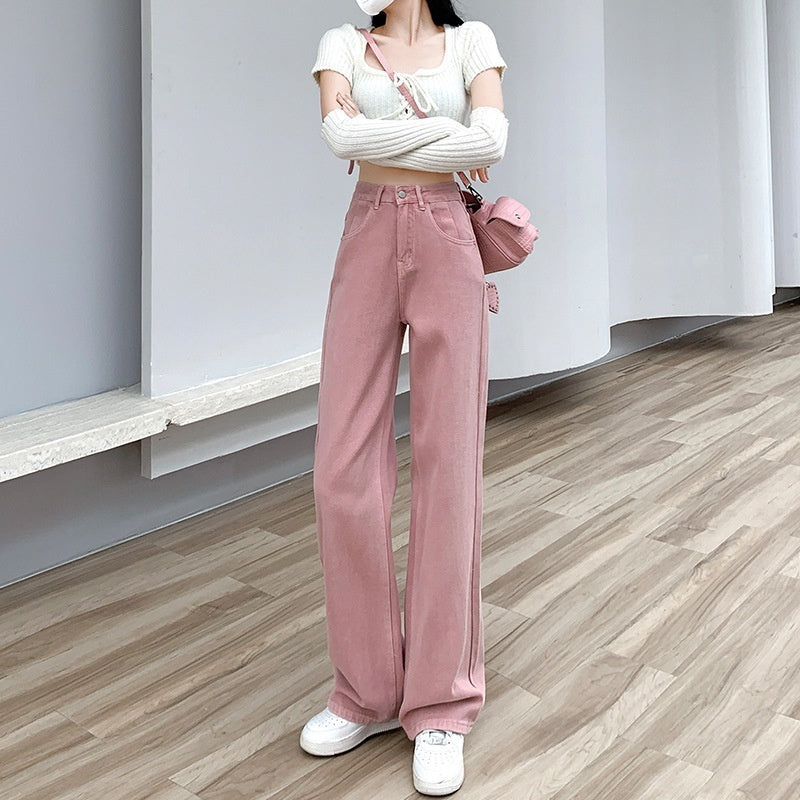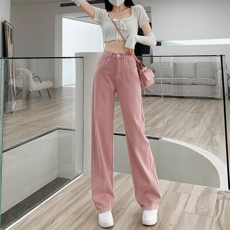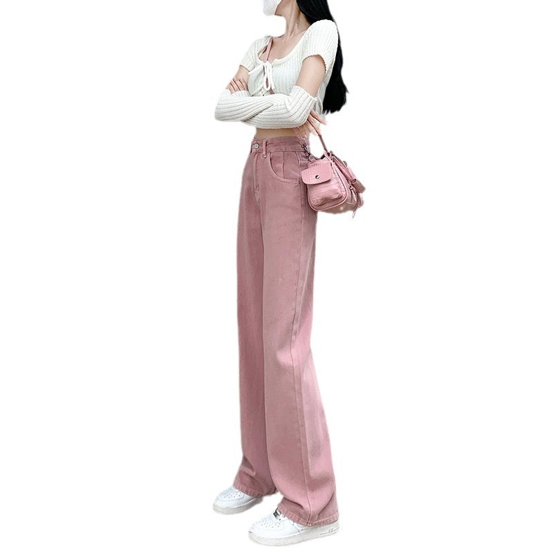 Dirty Pink Wide Leg Denim Women's High Waist Slimming Loose Straight Mop Pants