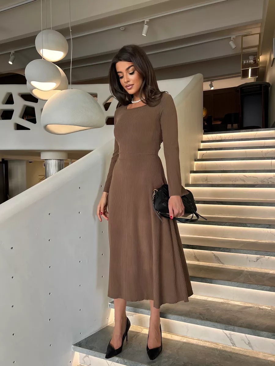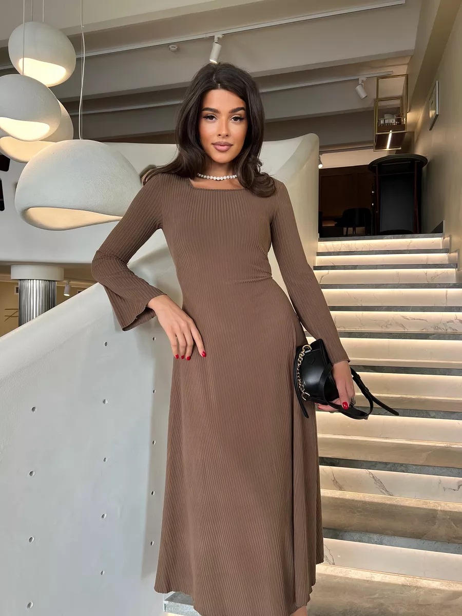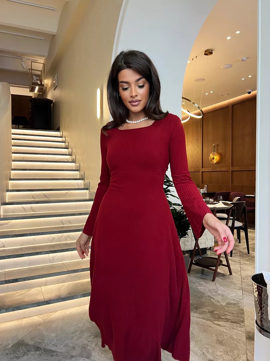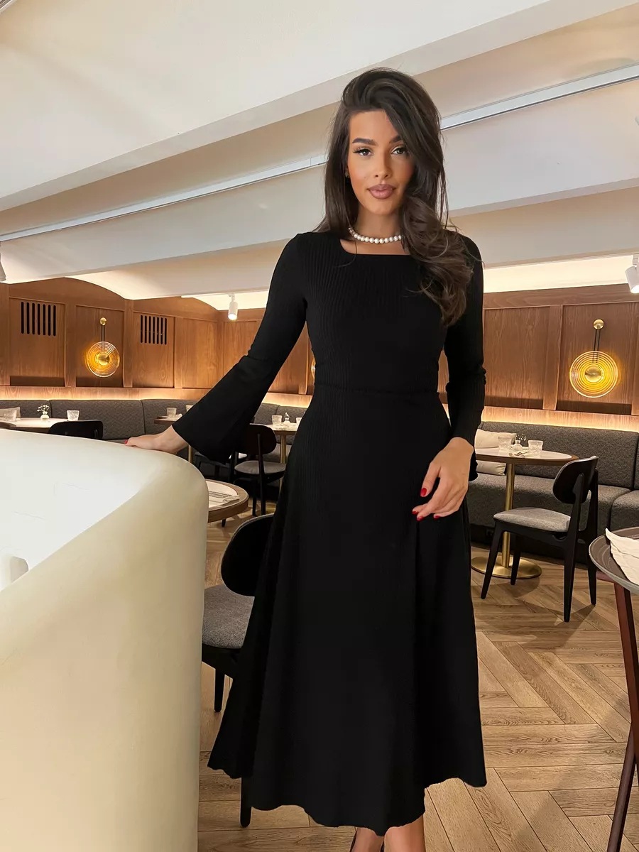 Fashionable Elegant Slim Fit Square Collar Long Sleeve A- Line Dress Women