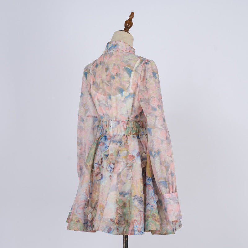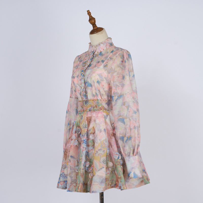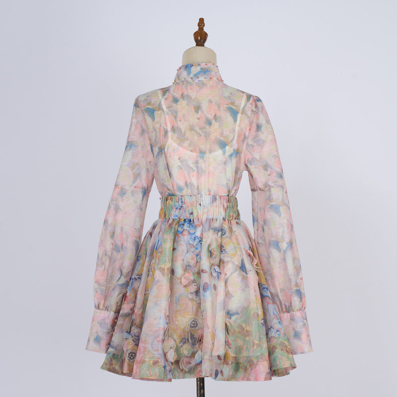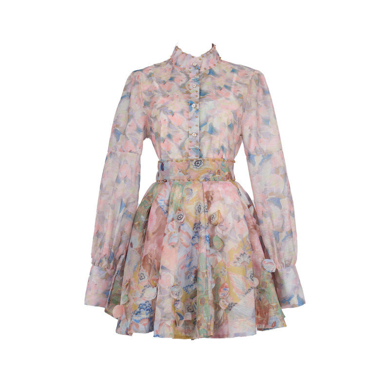 French Retro Stand Collar Printed Long Sleeve Slim-fit Top High Waist Skirt