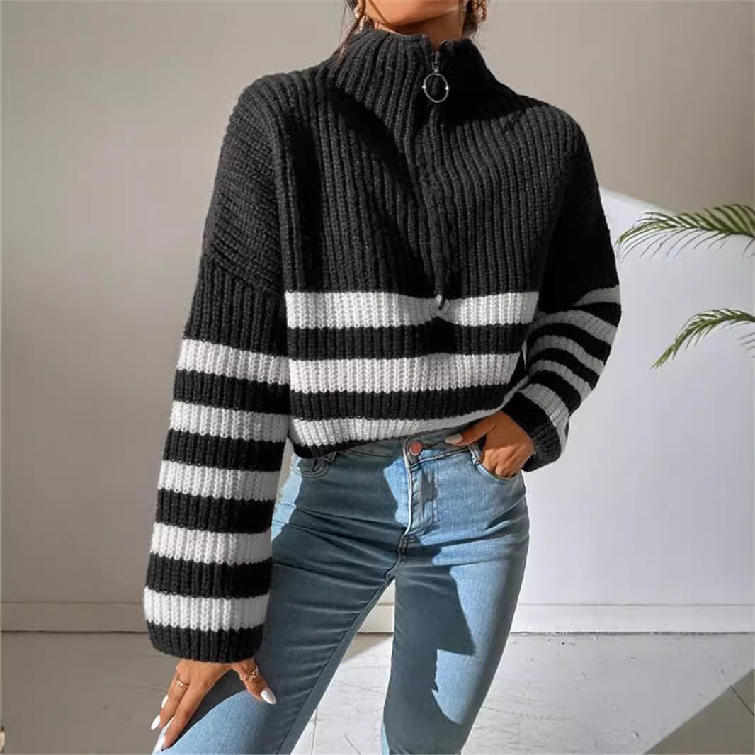 New Striped Contrast Color Stand-up Collar Knitted Pullover Sweater Outerwear Women