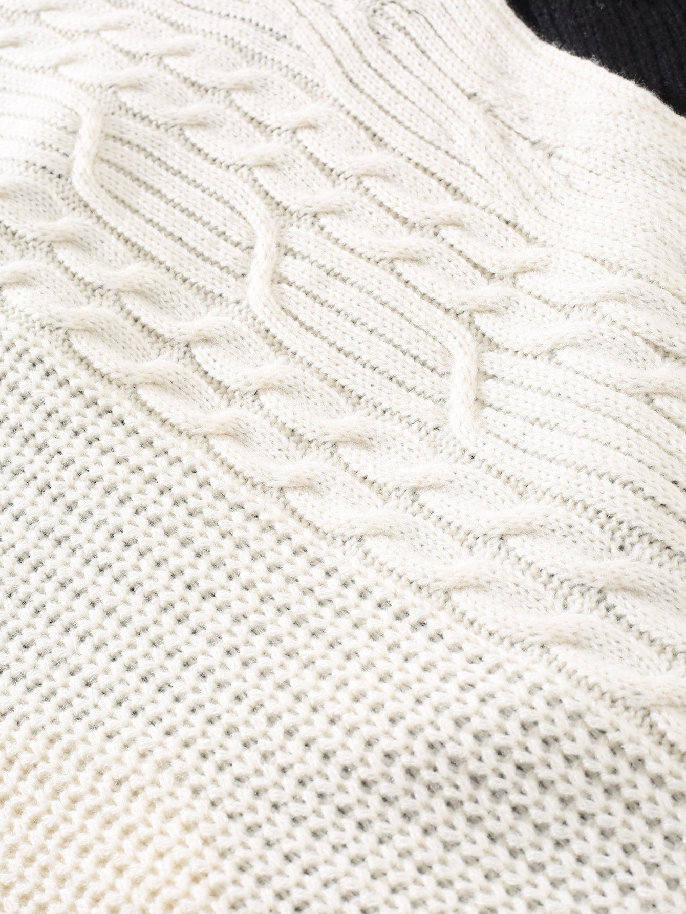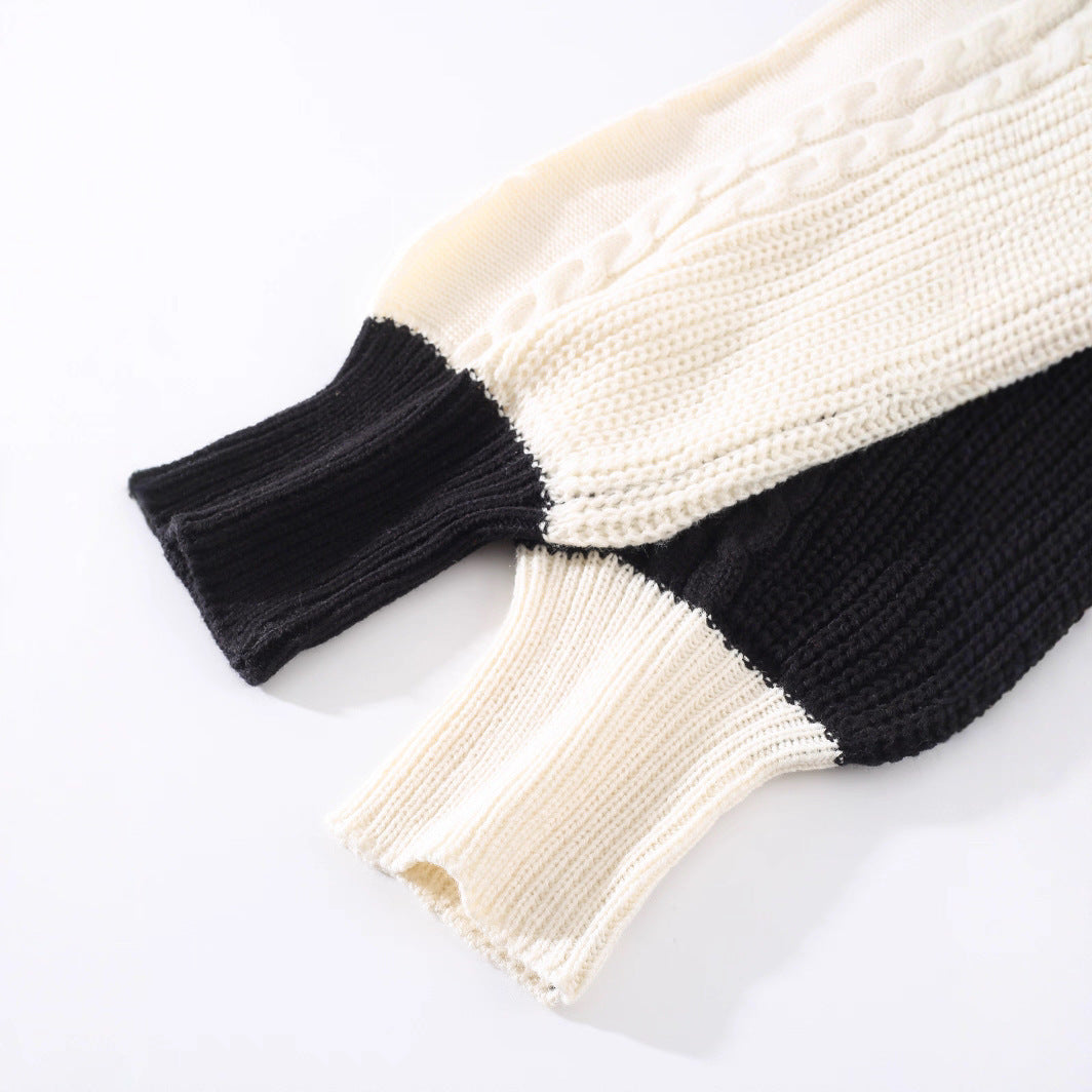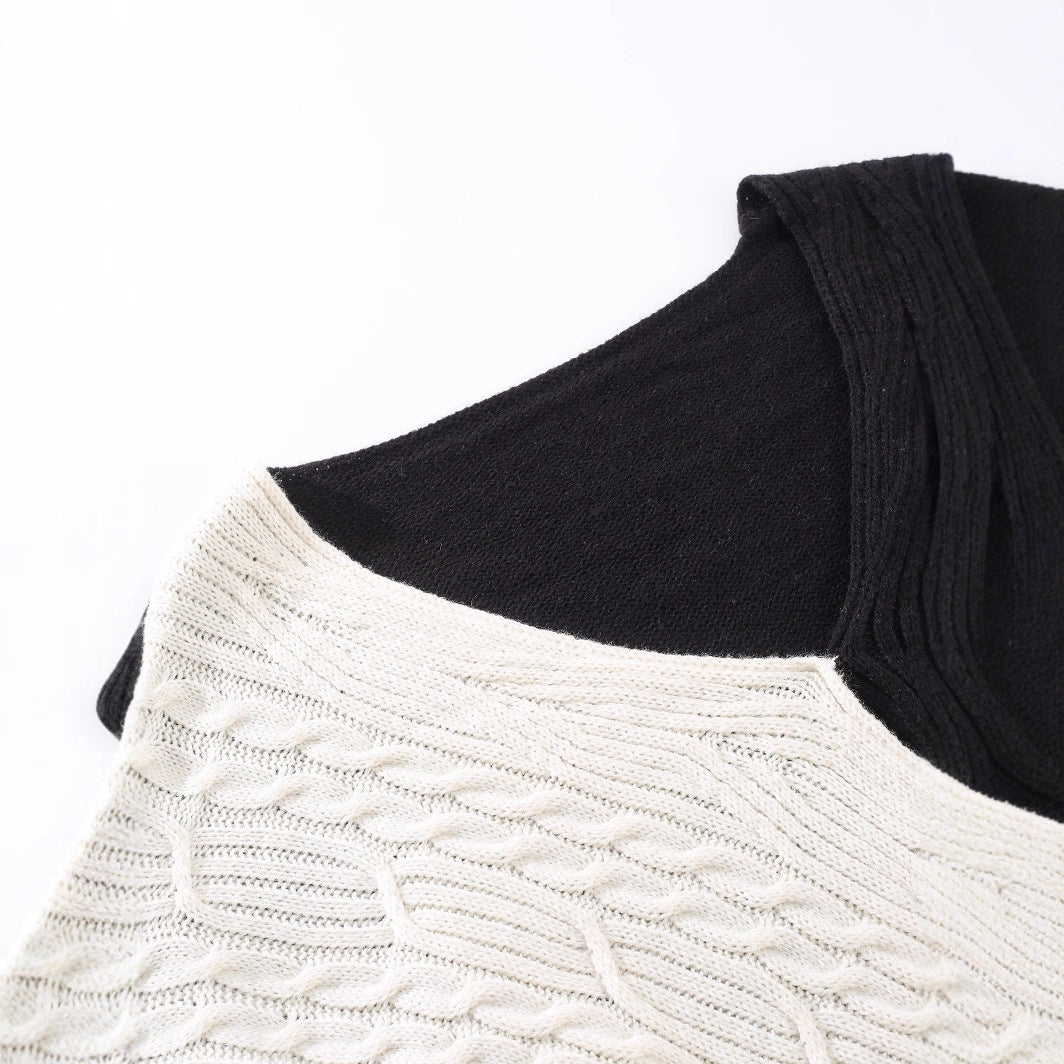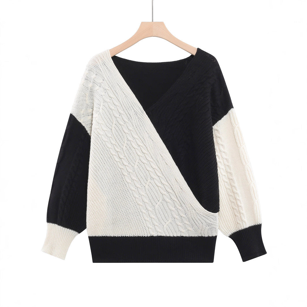 Plus Size Women's Black And White Contrast Color V-neck Long-sleeve Knitwear Top