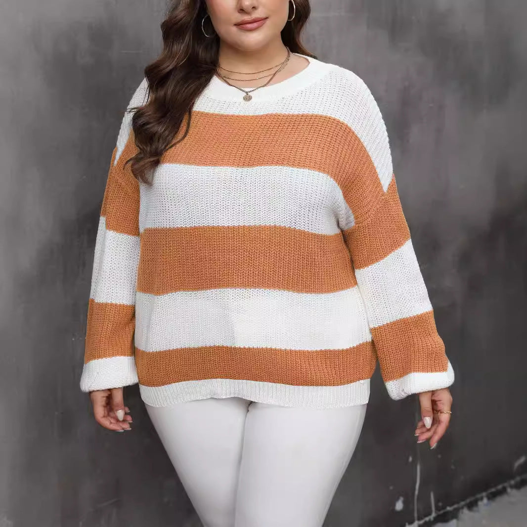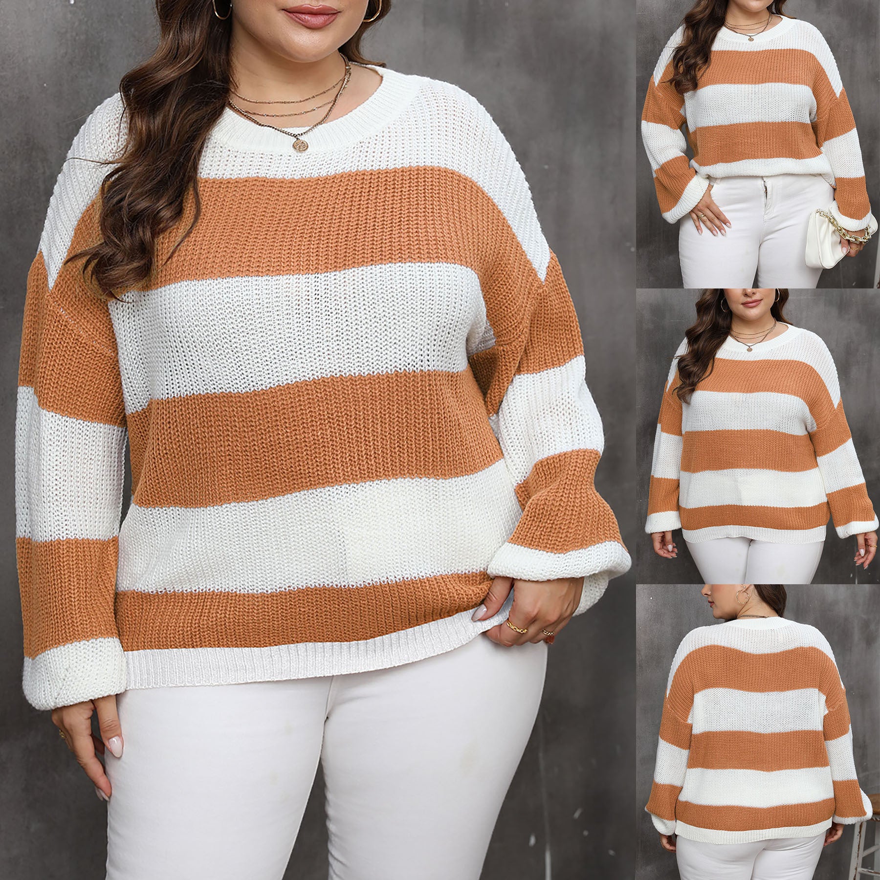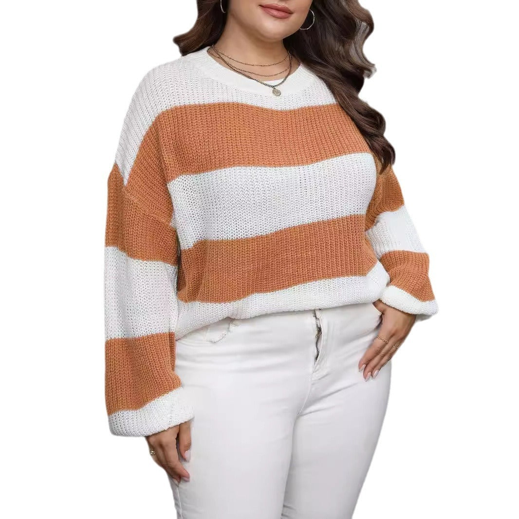 Plus Size Women's Clothing Style Contrast Color Striped Color Pullover Sweater