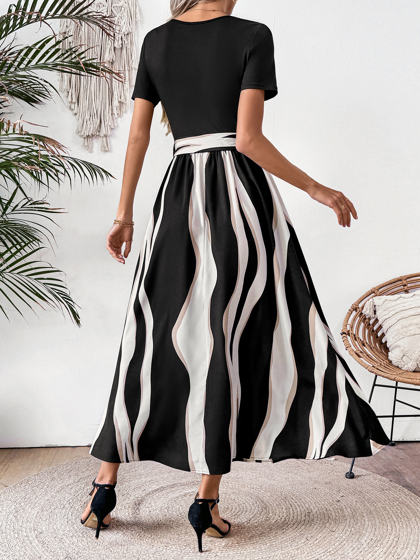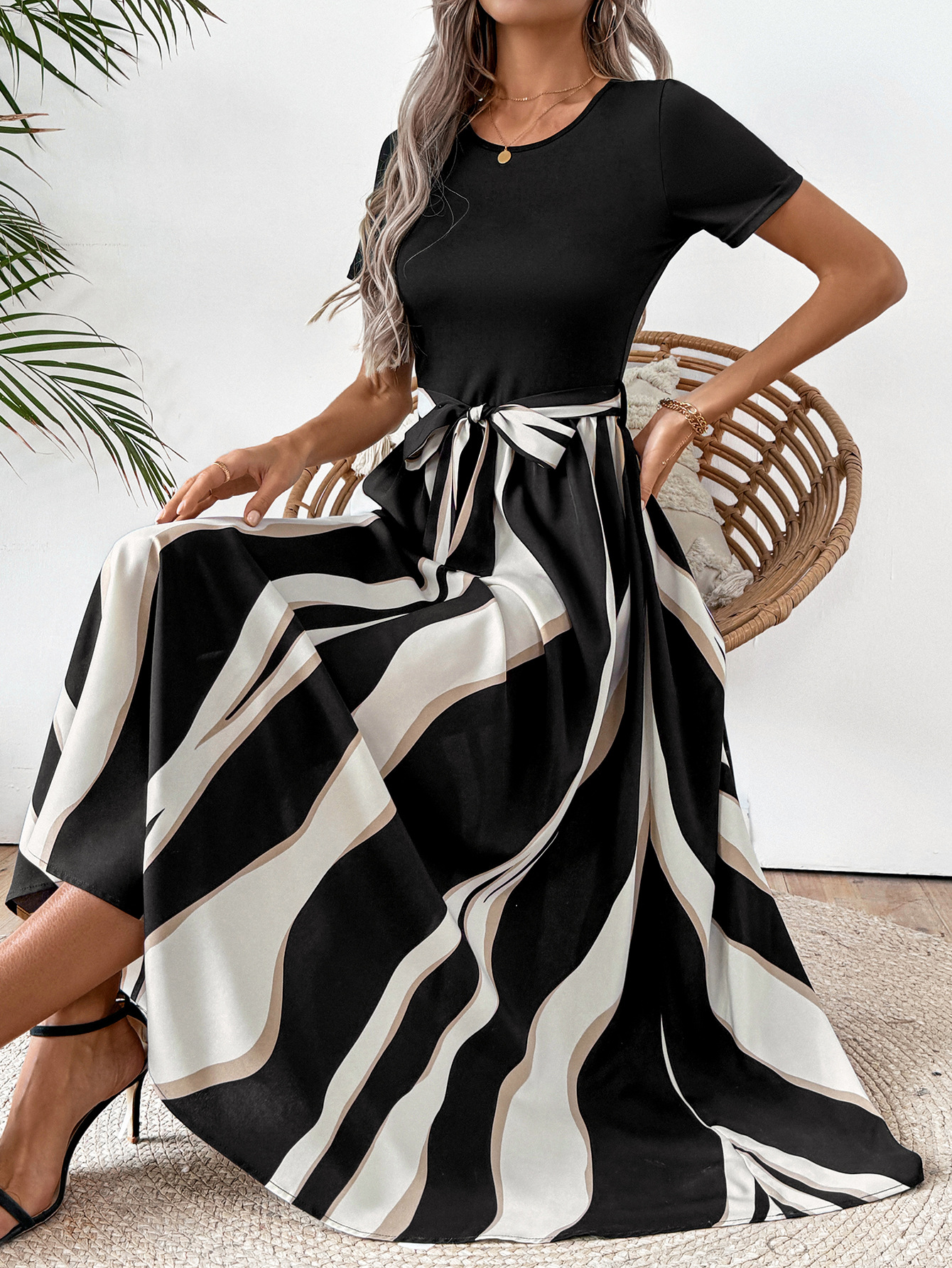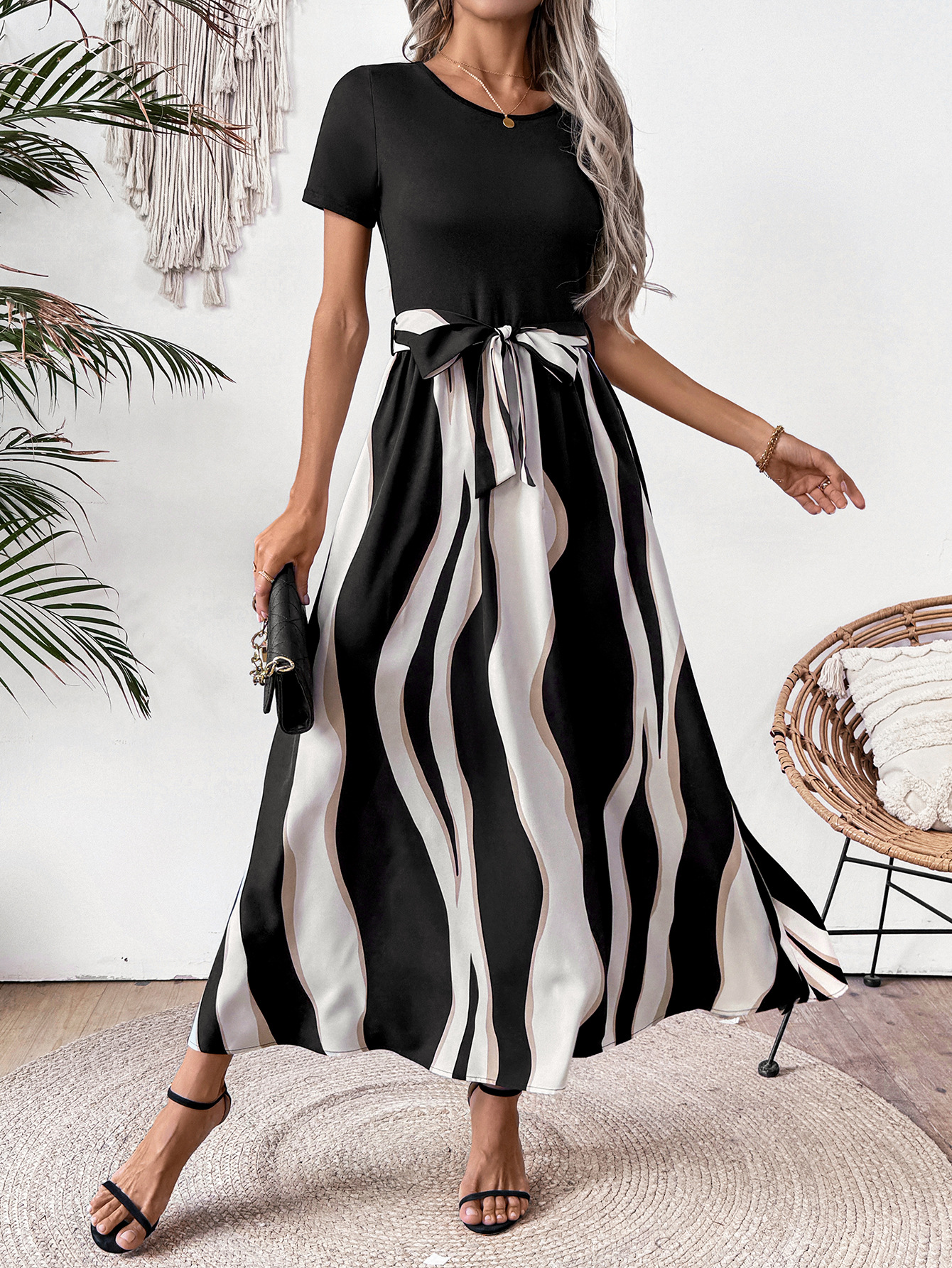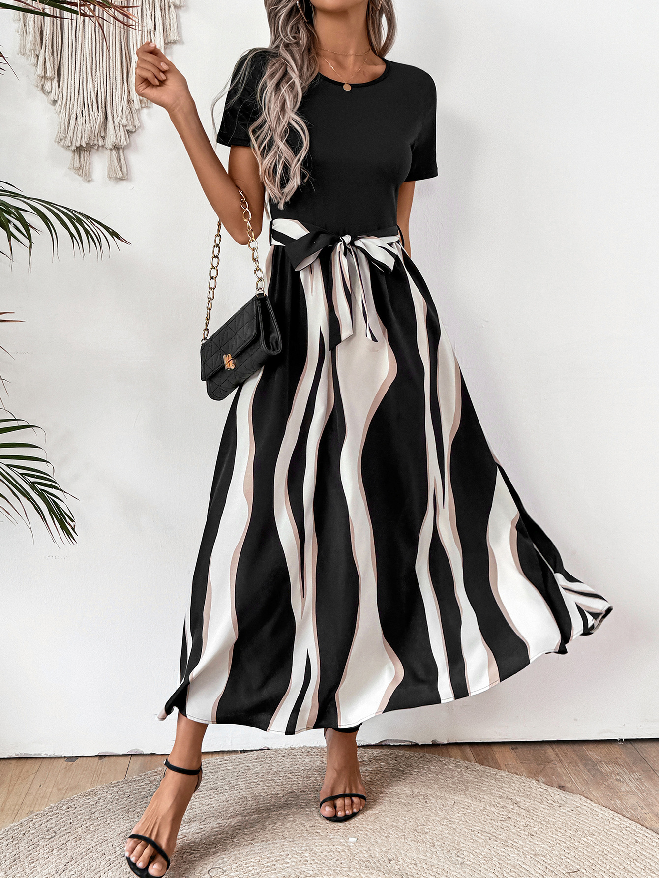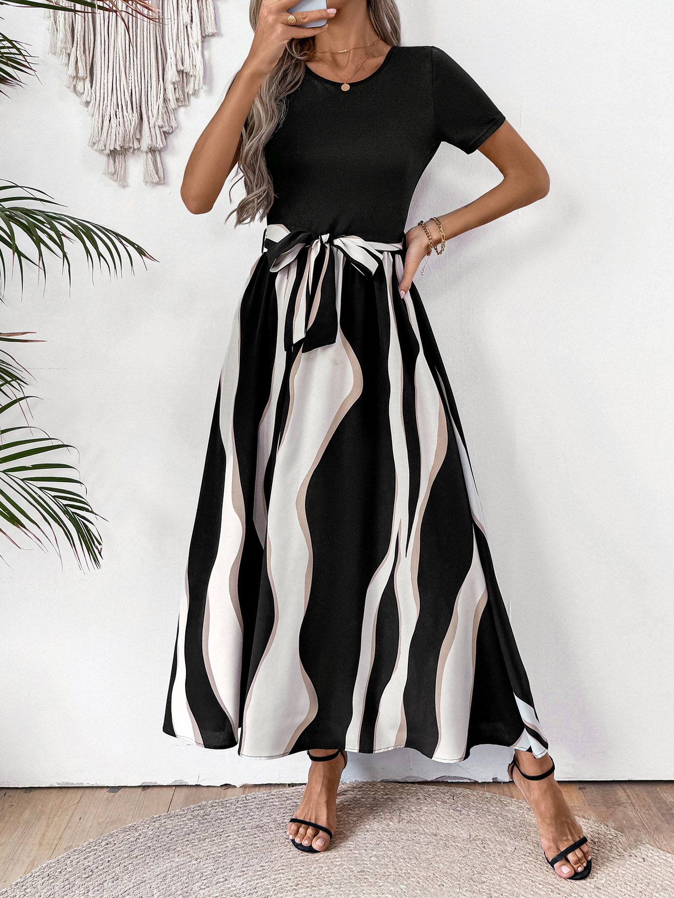 Round Neck Stitching Printing Short Sleeve Large Swing Dress