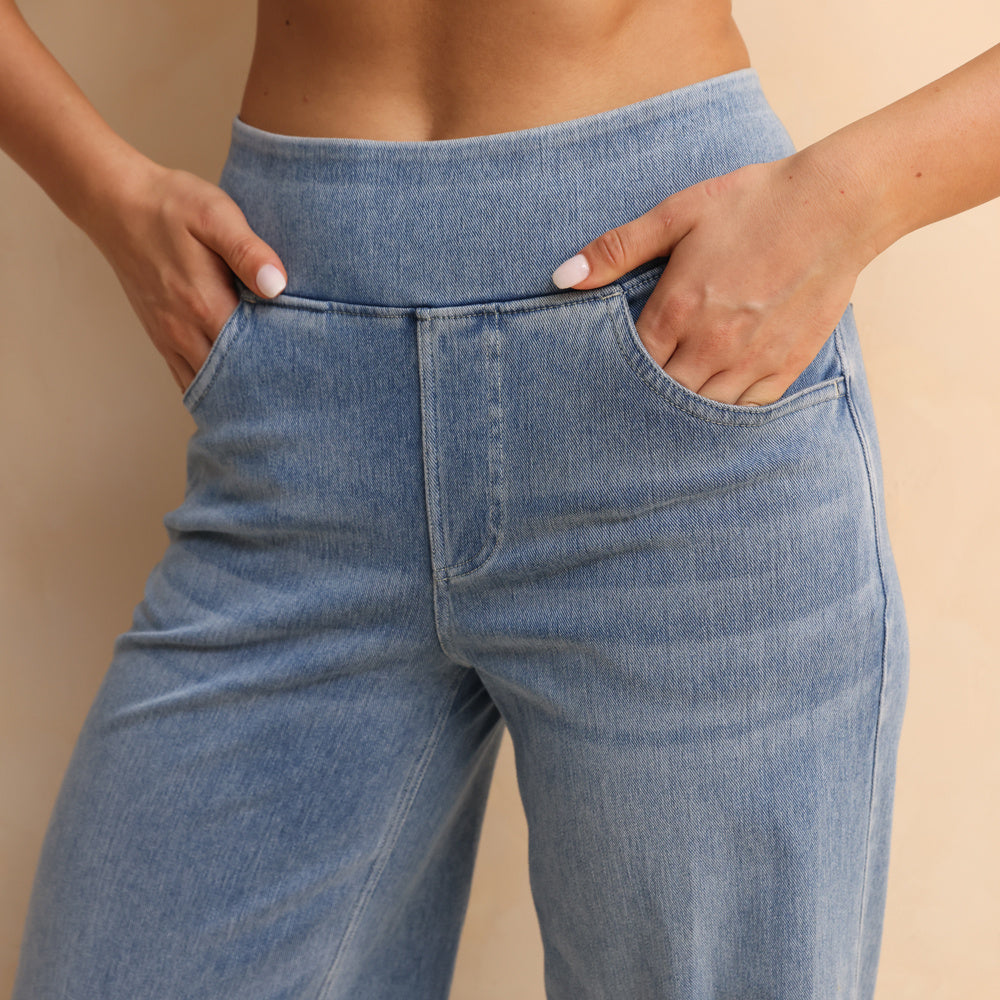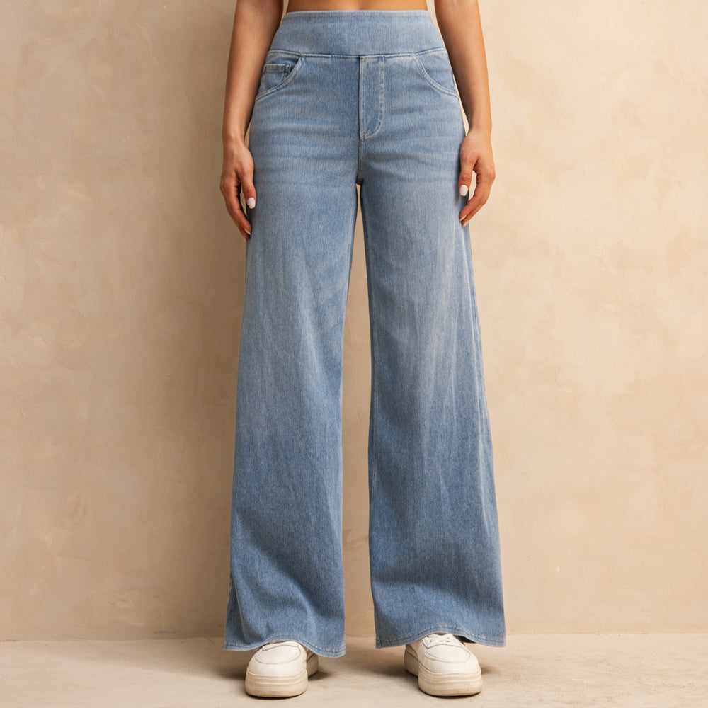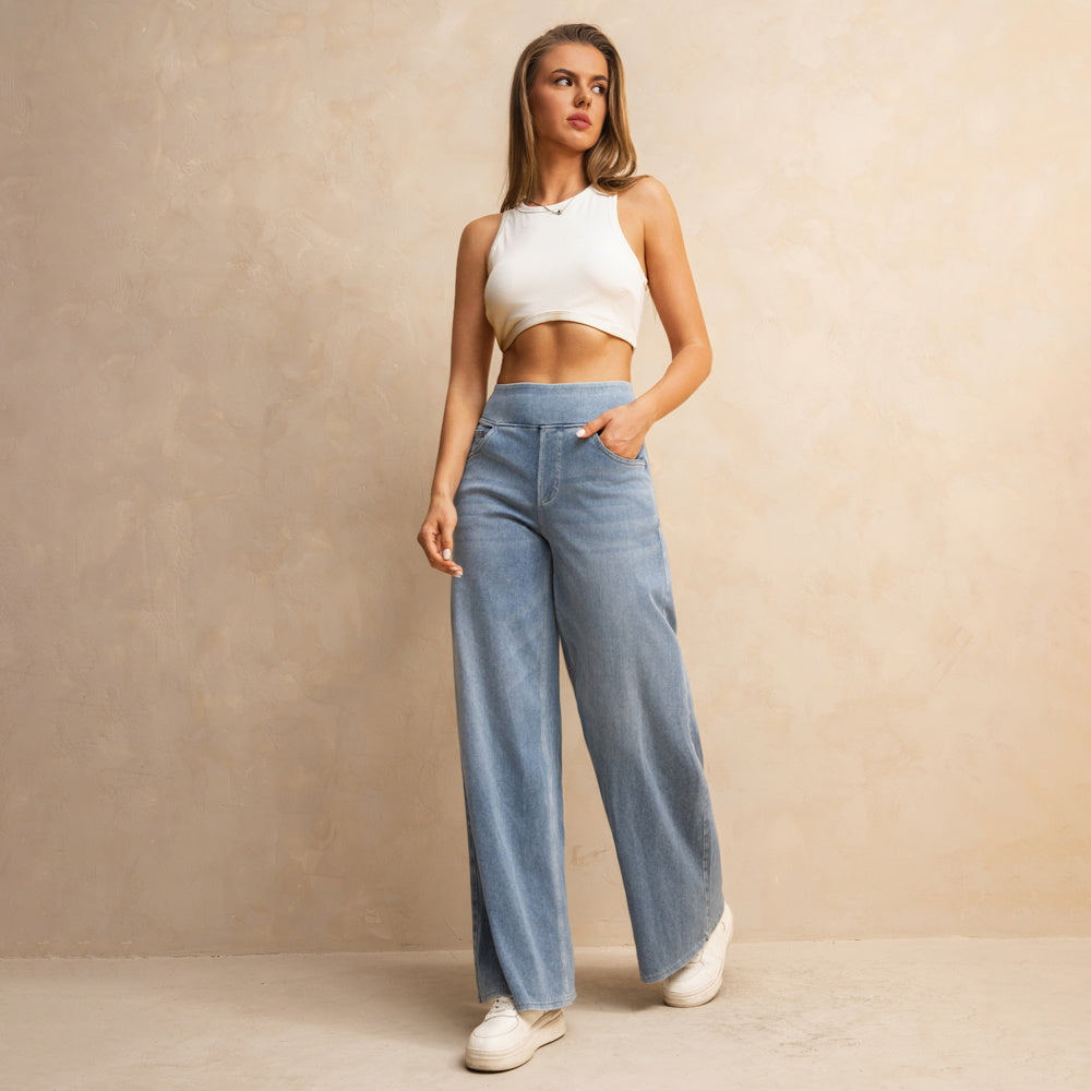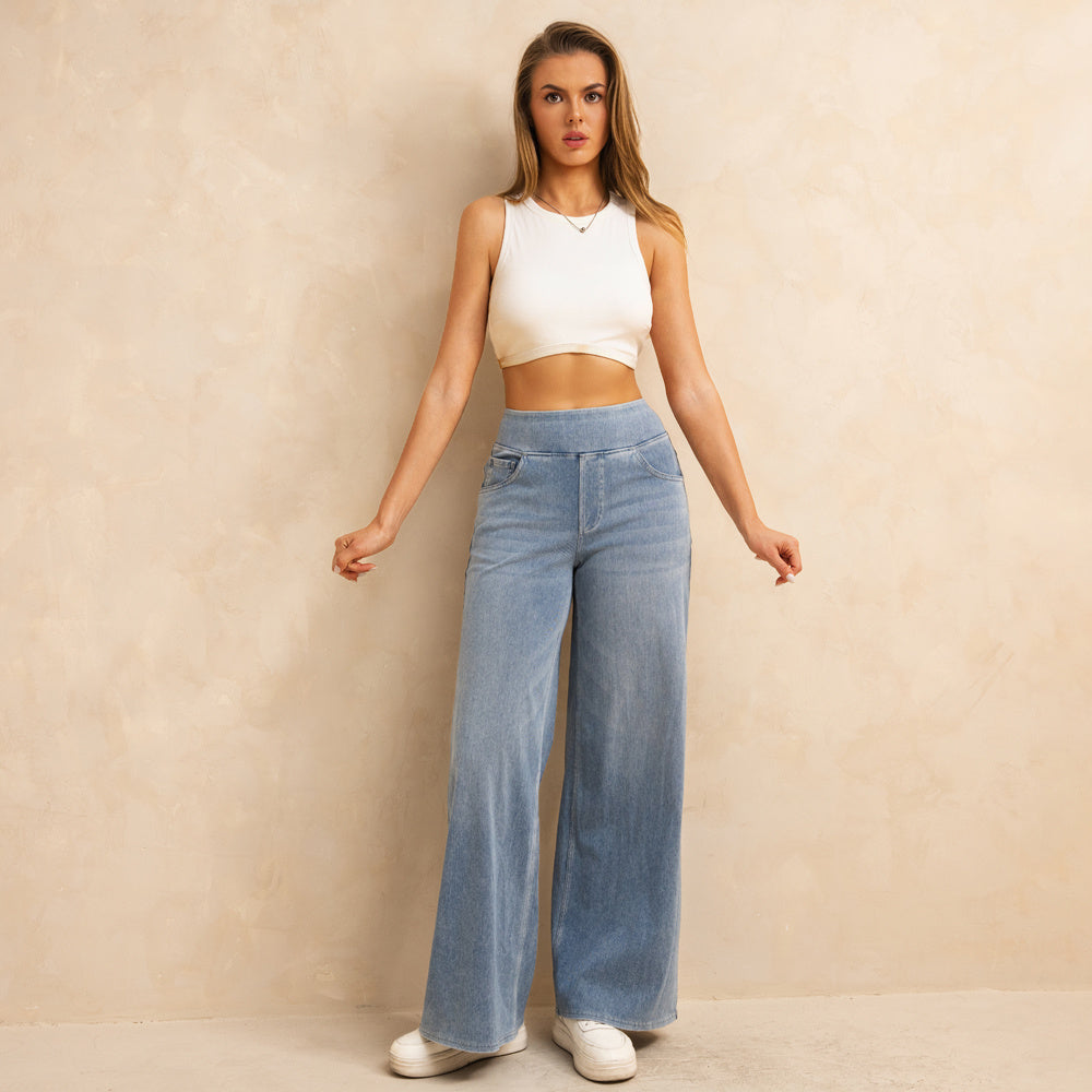 Shascullfites Melody Women's High-Waisted Wide-Leg Jeans Light Blue Casual Knitted Pants With Pockets Baggy Fit