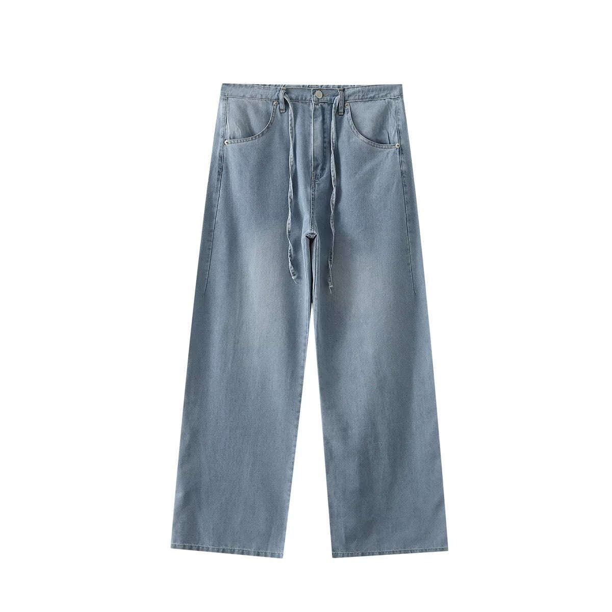 Summer Women's All-match Leisure Washed-out Lace-up Draping Mid-waist Straight Jeans