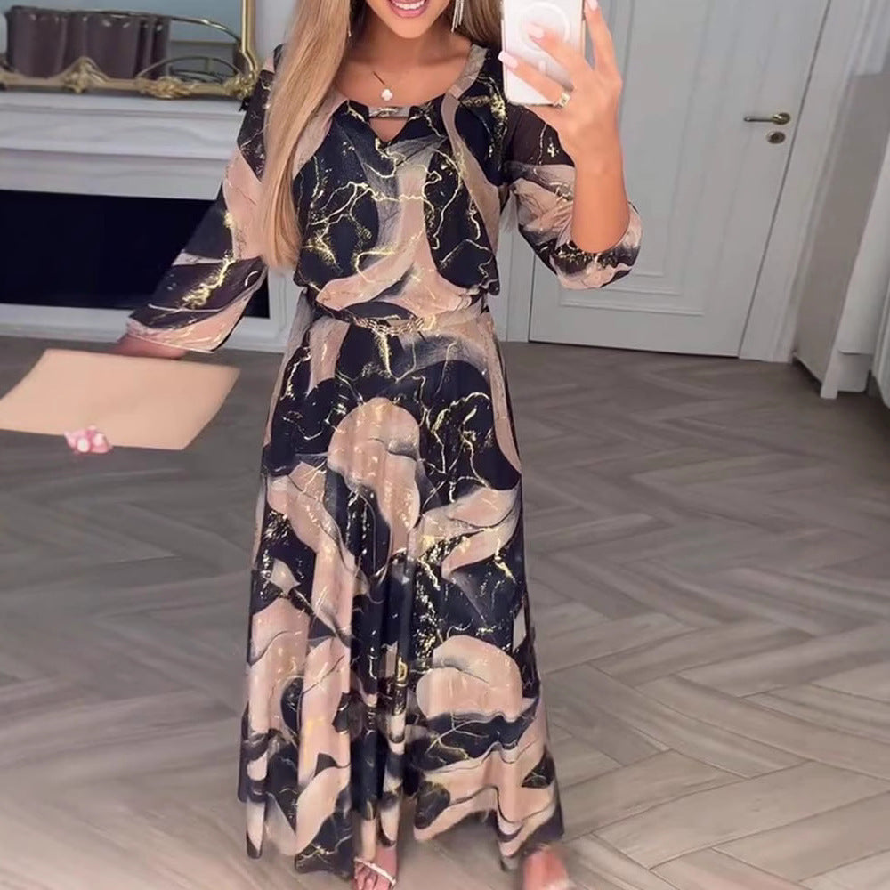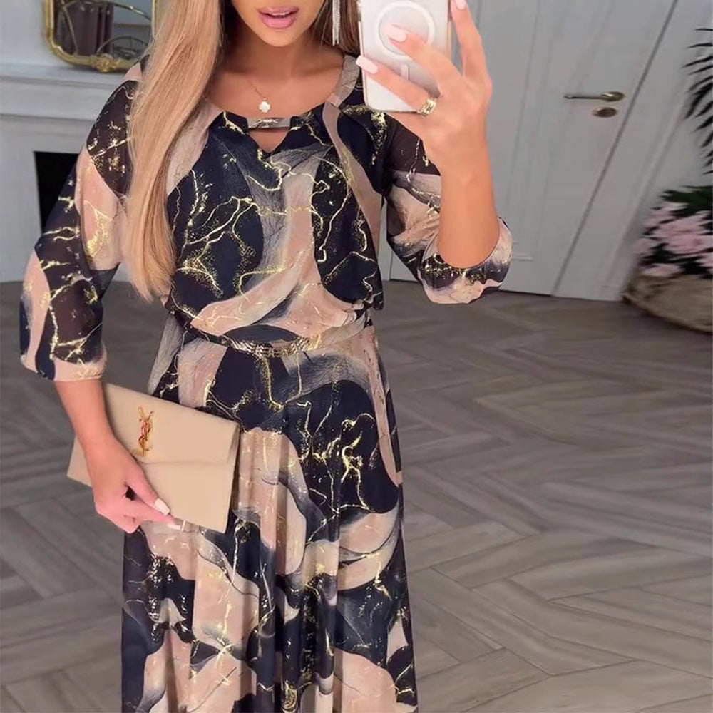 Temperament Elegant Cropped Sleeves Printed Waist-controlled Dress