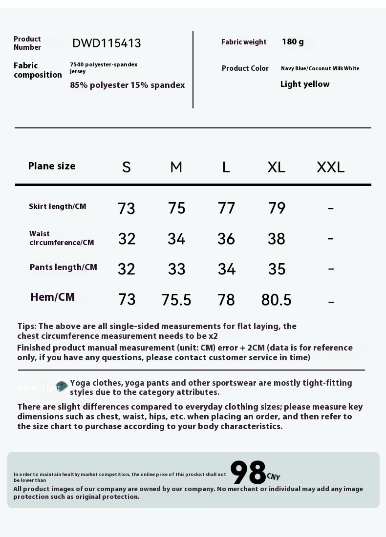 Material composition: 85% polyester and 15% spandex