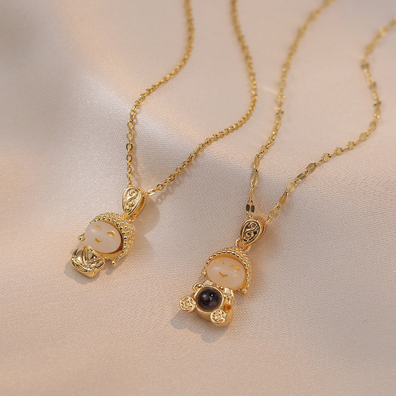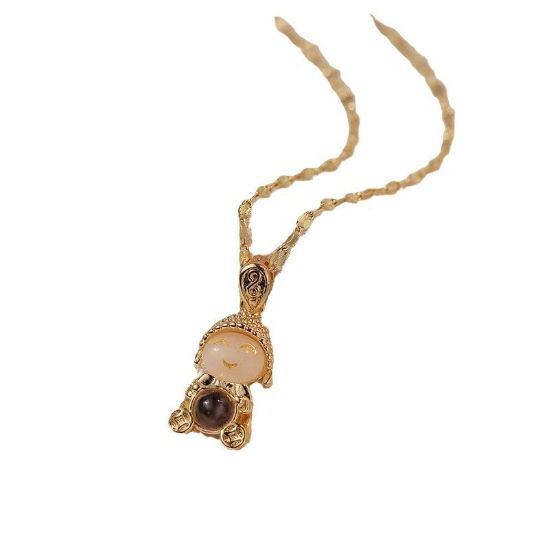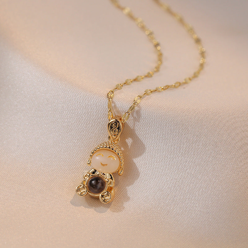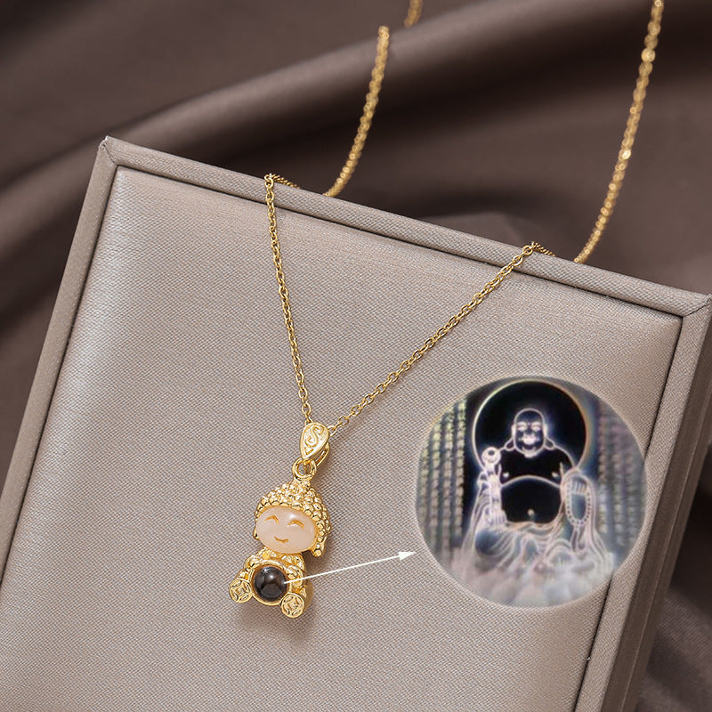 Titanium Steel Gold & Small Cute Buddha Jade Buddha Statue Necklace Lucky Maitreya Buddha Clavicle Chain